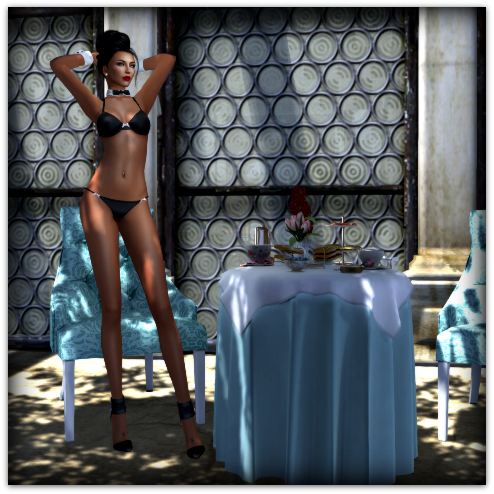 I’ve had the idea for this outfit for a while now, and since it seems new releases of classy lingerie for mesh bodies is sorely missing from the grid right now, I got busy and put this little number together. It is my hope it gives you a bit of inspiration…for in and out of the bedroom. Wonders if I would be ejected from a ‘black tie affair’ if I wore this? Hummm, something to think about. Grins wickedly. Happy Hump Day! Be kind to one another. TWMA♥