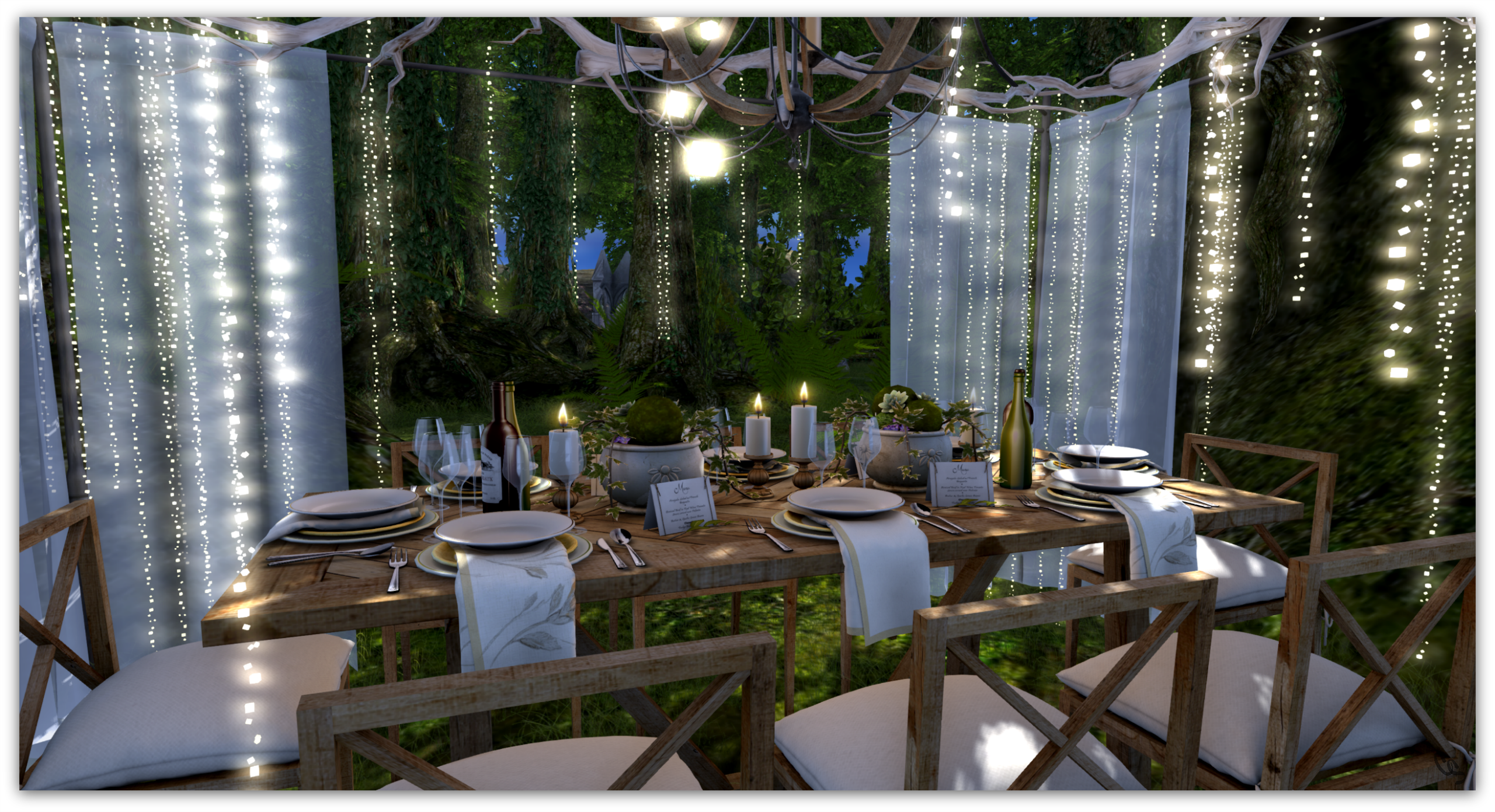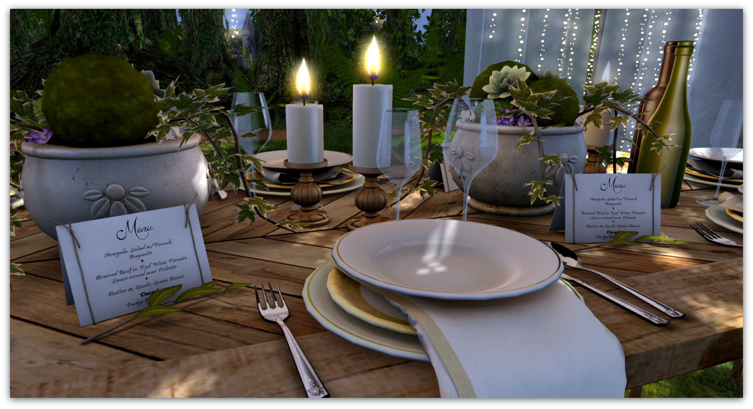 You can rezz out the complete set all at once with the rezzer provided, or use pieces individually, which is another plus. The set has an extensive animation menu for male, female and child, and there is a variety of food and drink choices. Everything you see in the photos is included except for the topiaries and sting lights.