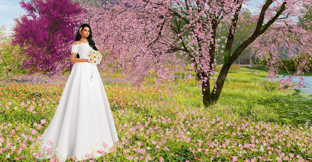 In all my 11 1/2 years of blogging, I have never blogged about a bridal gown. Well, I broke that streak today. I am wearing another lovely gown from Poison Rouge called Perfume de Jazmin. The bodice is a plethora of flowers and reminds me of my favorite, the daisy. I just so happened to have a daisy bouquet in my closet. Imagine that! I can visualize this as a first-life creation. I want it!