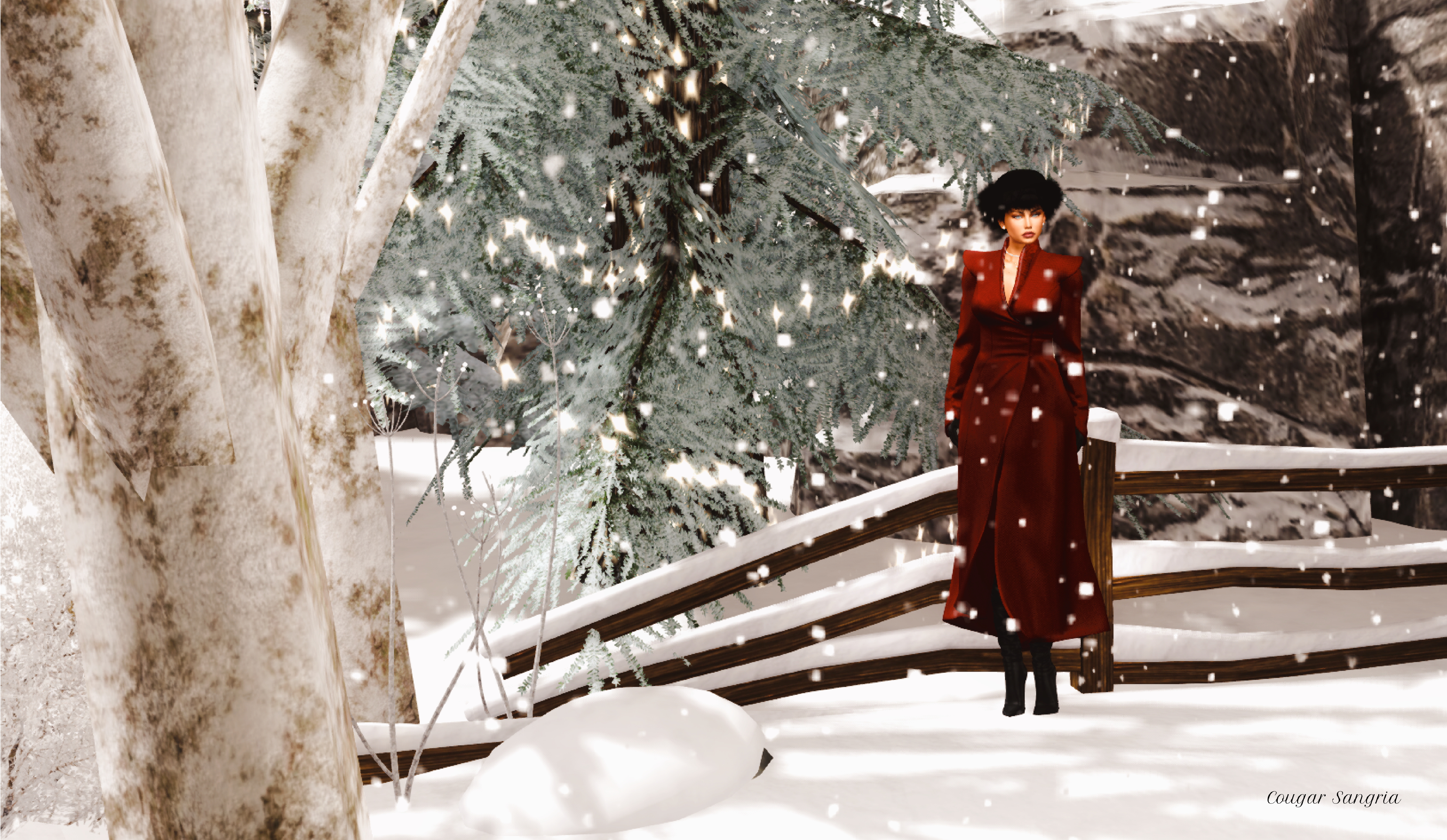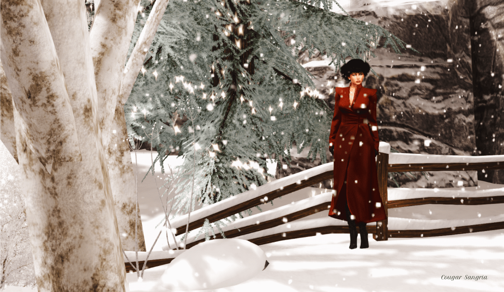 I have long wanted to blog about this coat. It’s vintage Plastix, and the lines are just gorgeous. The fit is for Lara5.3, but I managed to squeeze LaraX into it with little difficulty. Smiles. The hat is vintage as well by SF and is no longer available. I will never put it out to pasture. I love the flex fur. It’s like the wind softly blowing through it. Mesh can’t do that…yet. I am also wearing my favorite shoe creator, GOS. The Slouch boots are classic. The gloves are by MEVA, and no longer available. The outfit is completed with jewelry by RAMA, Tetra, and AvaWay.