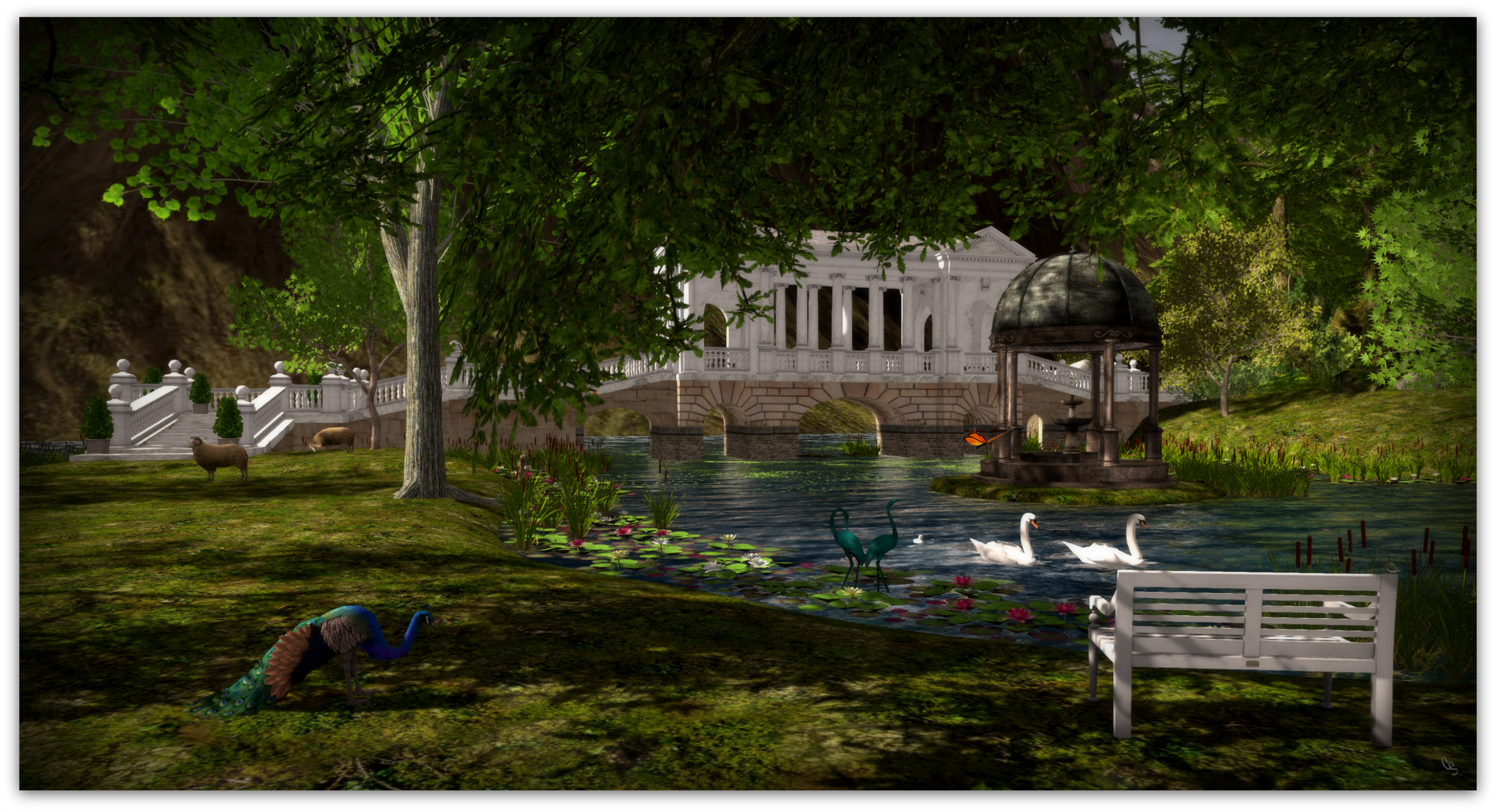 In Second Life I can browse on Marketplace, dig in pixel dirt or take a meander around many of the established communities one can find here. It was on Marketplace that I discovered the Palladian Bridge which is a replica of one at Wilton House located near Wiltshire, England. I erected the bridge, did some editing and lived with it for while before deciding it didn’t quite feel right. So a couple of days ago I went back to Marketplace and bought the Catherine the Great version, erected it and still something seemed amiss. Doing a bit of research on the internet I discovered what I felt to be wrong with the newest version…It was just too white. So I melded the two bridges together and after adding another section of walkways and stairs at one end I am happy with the finished result. I intend to spend many a peaceful moment here. Be kind to one another. TWMA♥