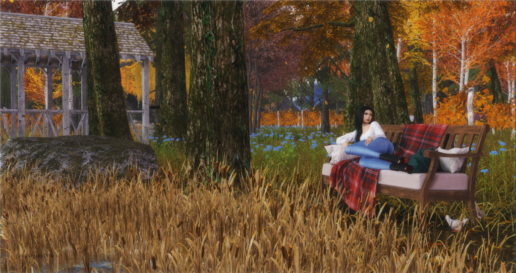 I was sitting on this new bench I bought at Chez Moi and thought to myself, “This scene is just begging to be photographed,” and so I did. The pose is one of the animations built into the bench, and I patiently waited for a good shot. I never thought that the fall season in Second Life could rival summer, but I was wrong. This fall season has been my favorite to date.