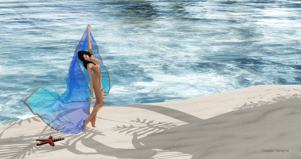 About the photo: Long ago I used the same pose and silk to do a similar shot. Long, long ago. Pre-mesh days. The quote above is the inspiration for this photo. Just a girl, the beach and the ocean. Oh! how I love the ocean.