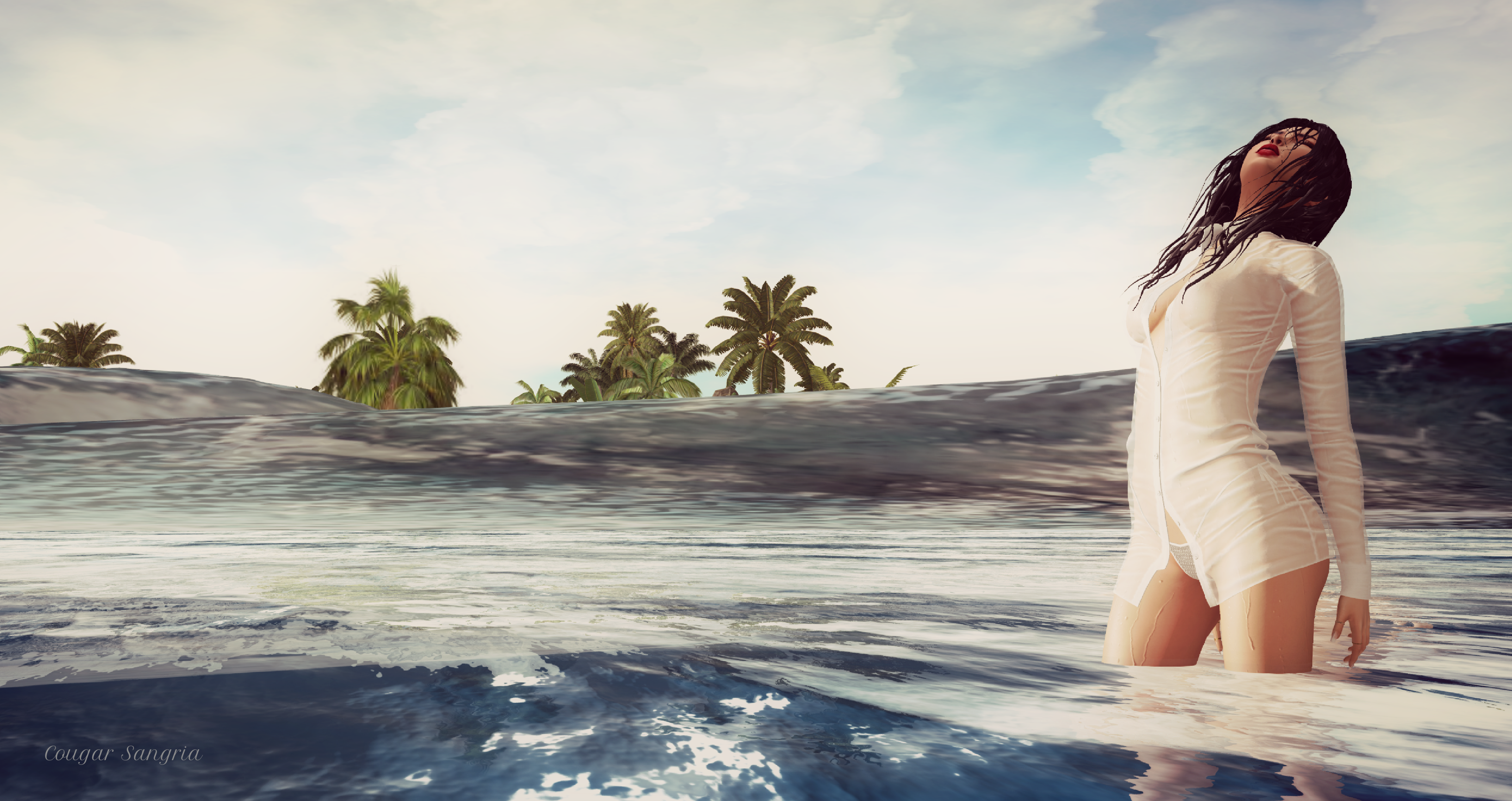 When doing a beach shot, my first and only choice is Surfer’s Bay VIP. The regions are well done, and the soundscape is pleasing to the ears. The VIPs have always been polite and are mindful of others’ privacy. One can find me copping a squat whilst I process photos in PicMonkey, upload to Flickr, or work on a blog post. I’ve been known to park Cougar at Surfers for hours. During the late hours when the regions are sleeping, I can run naked at my leisure with no one but the sun or moon watching over me, depending on my windlight. I’m such an oddball, but I have my reasons for being so protective of Cougar. Surfer’s Bay VIP is nude or beachwear, which is another reason I enjoy the regions so much. You have a choice. Duncan and Persia have done a fantastic job creating a stunning tropical paradise, and get this, you can surf too. I think I might learn to surf or maybe continue to do what Cougar does best, sit and look pretty.