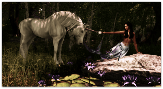 This photo shoot was inspired by another photo I saw on Pinterest.  I have a board full of fantasy photos that I want to recreate in Second Life.  This took me the better part of a whole afternoon and early evening to put together as I’m not used to getting two avatars ready.  Kat, my mini-me was my go to for the water horse.  Yes, she has her own for just these occasions.  She was good to go once I put a full body alpha on her.  All she had to do was hop on the pose ball.  Easy, peasy!  Yeah, right lol.