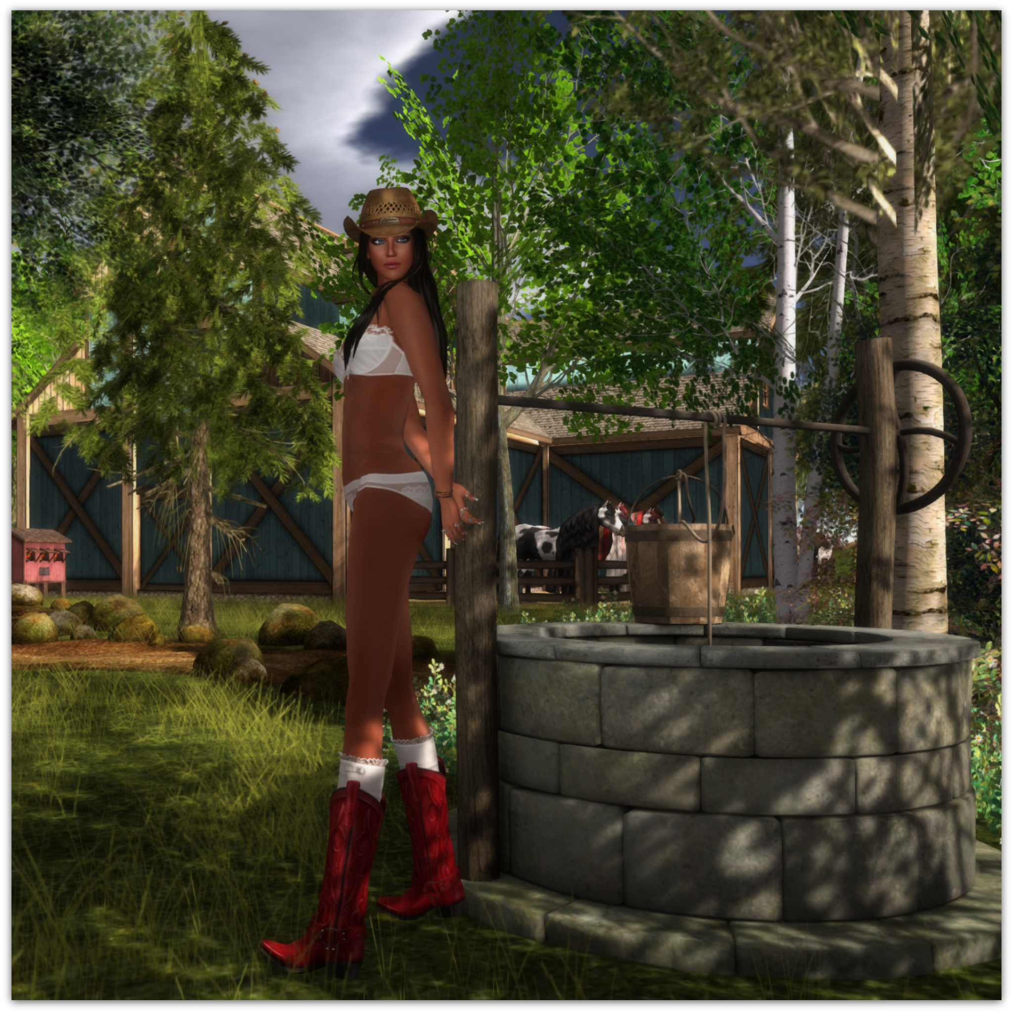Wearing my favorite hair with cowgirl hat as well.  I am wishing for some long hair that falls down to my waist with a cowgirl hat, and has no hair hanging over the front, cause sometimes a gal wants to show off dem puppies ya know.  Well…at least I am not afraid to show em off, and if the men can show theirs, so can I 😛  Happy Hump Day!  Be kind to one another.  TWMA ♥