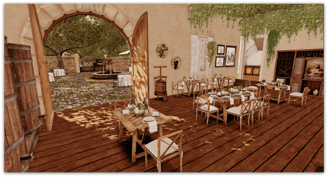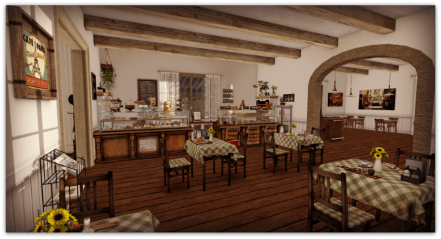 I pulled out everything I could find in my inventory to furnish the cafe. Even shopped for a few new items.  That last remark is an understatement.  Most of the build is interactive.  The outdoor dining and micro-winery have menus for a complete dining experience, and the pub tables do have a few games you can actually play along with drinks.
