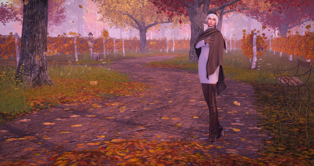 I was just browsing around *COCO* and came across this outfit. I thought to myself, “This would be perfect for a fall photo shoot.” Of course it’s standard mesh, but that did not stop me. It took me all of 1 hour to put the outfit together, take the shot, and then process it. I tend to process sparingly, but I am pleased with the way this turned out. Better than I could have hoped for. Paired with Eva Cassidy singing, well, it’s just about perfect to my way of thinking.