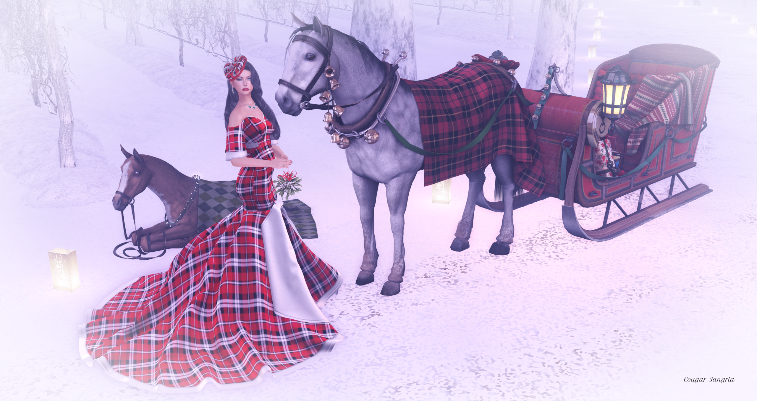 When the announcement came in PurpleMoon’s group chat, and I had a peek at the release, I knew this gown (My Plaid Xmas) would be mine. Plaid is in my blood. Although I am half Cherokee, I can also claim Irish, Scot, and British ancestry. I have loved plaid as far back as I can remember. Thank you, Poulet, for designing a gown that is so extraordinary. I squealed with delight when spying the exquisite fascinator. Just saying, ladies, this gown would be perfect for a Scottish wedding.